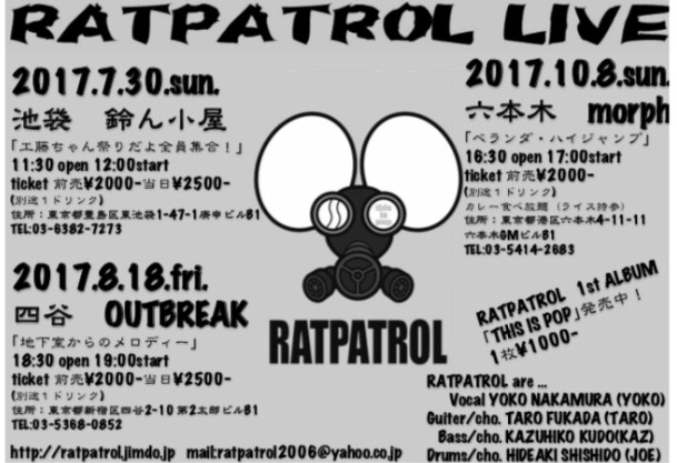 RATPATROL7月8月10月LIVE情報! 7月30日(日) 池袋鈴ん小屋 http://www.ringoya.org 「工藤ちゃん祭りだよ全員集合!」 チケット:前売り2000円/当日2500円(別途1ドリンク) 時間:開場11時半/開演12時 ※RATPATROLの登場はTOPの12時! 8月18日(金) 四谷O... -