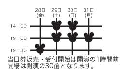 2005年10月28日(金)〜31日(月) 池袋シアターグリーン・メインホール 豊島区南池袋2-20-4 03-3983-0644 料金/全席指定2800円(前売・当日共) 先行予約期間中に御購入いただいたお客様には オリジナルグッズをプレゼント チケット取り扱い 劇団予約 エ070-5570-4898 03-5982-0398(FAX受信のみ) E-mail : colorchild@toys.co.jp チケットぴあ エ0570-02-9966(オールジャンル) エ0570-02-9988(演劇専門) Pコード 363-343 |